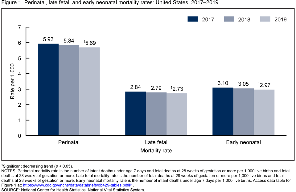- The U.S. perinatal mortality rate declined by 4% from 2017 to 2019, to 5.69 perinatal deaths per 1,000 live births and late fetal deaths in 2019.