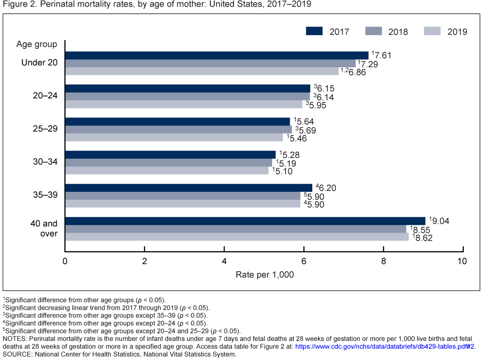 - Age-specific perinatal mortality rates decreased with age, starting with women under 20 (6.86 in 2019) through 30-34 (5.10 in 2019) and then increased among older women, reaching a high of 8.62 for women aged 40 and over.