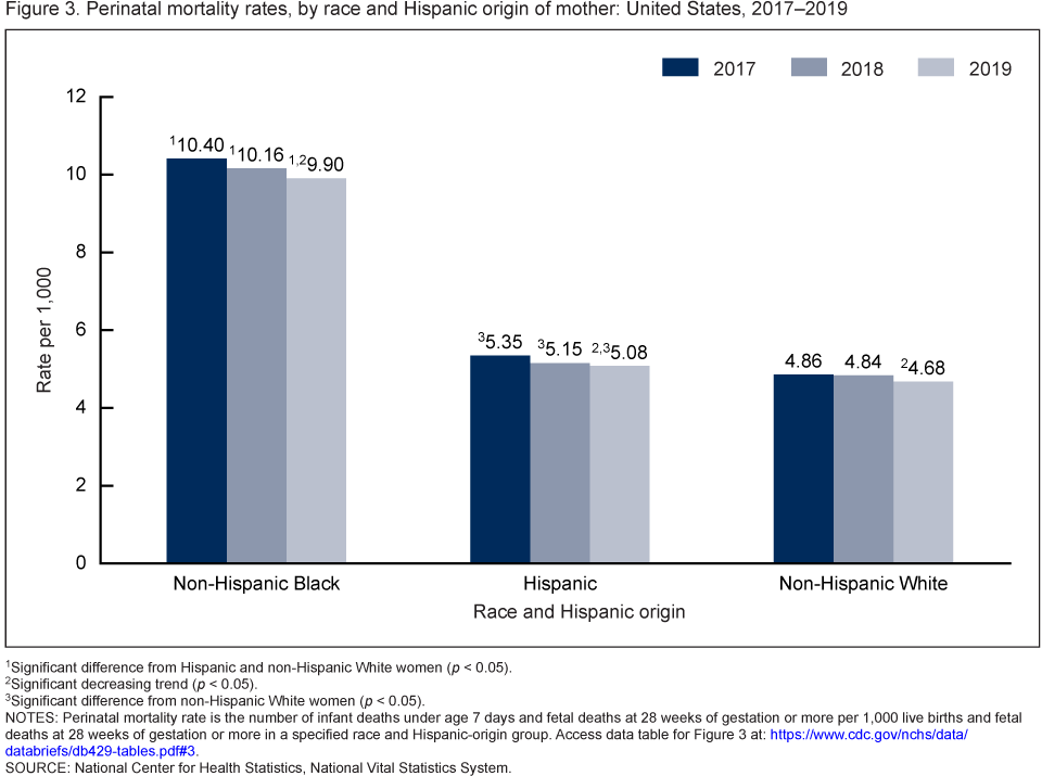 - Perinatal mortality rates declined by 4%–5% for the three largest race and Hispanic-origin groups (non-Hispanic Black, non-Hispanic White, and Hispanic women) for 2017 through 2019.