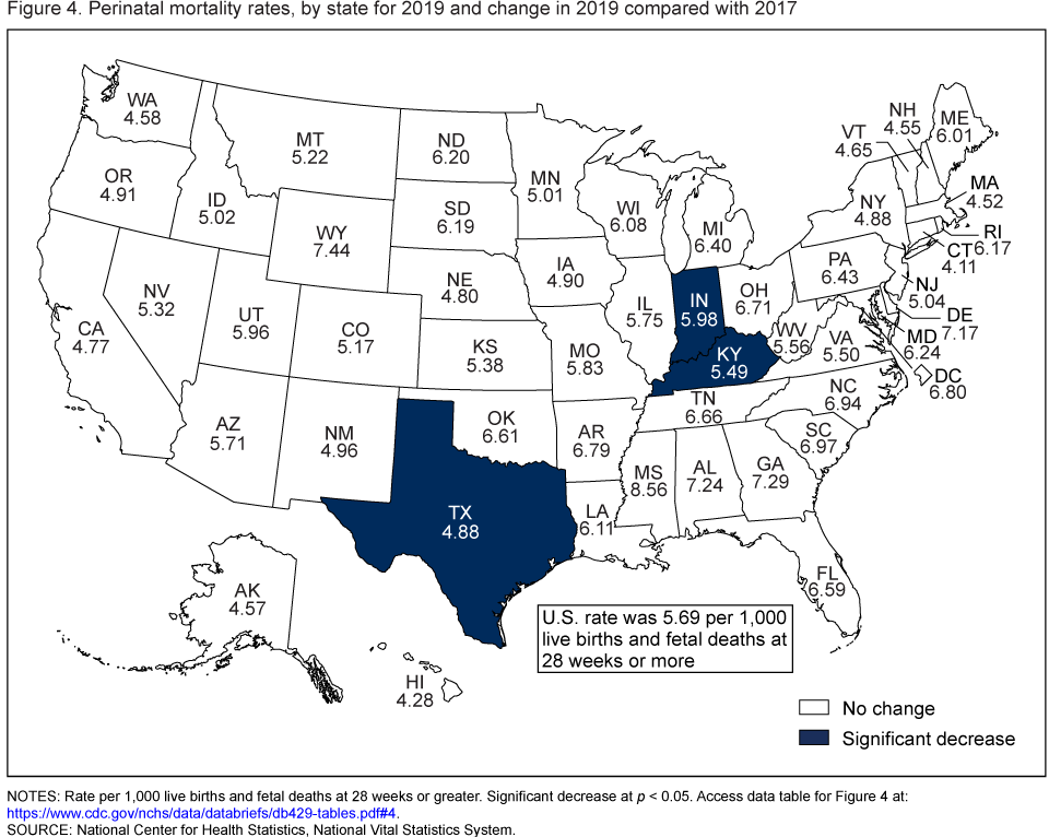 - Perinatal mortality rates declined by 19% in Kentucky (from 6.79 to 5.49), 13% in Indiana (from 6.90 to 5.98), and 11% in Texas (from 5.50 to 4.88) but were essentially unchanged in 47 states and the District of Columbia in 2019 compared with 2017 (Figure 4).