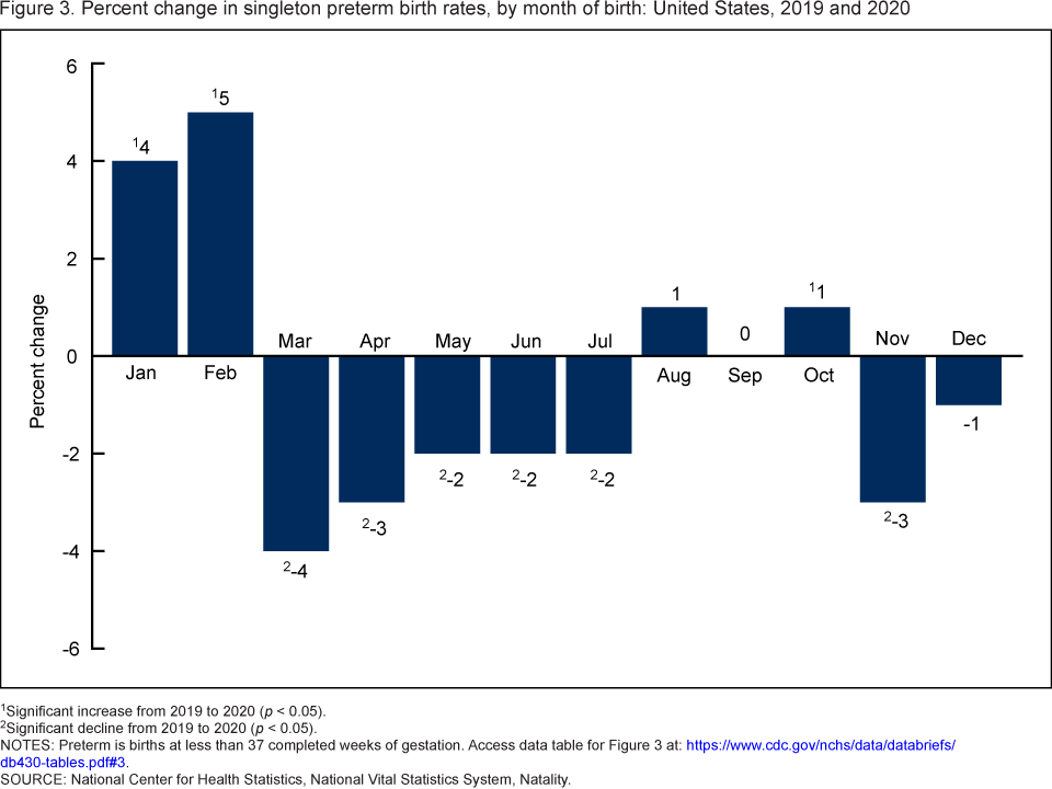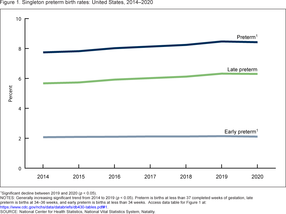 Martin JA, Osterman MJK. Exploring the decline in the singleton preterm birth rate in the United States, 2019–2020. NCHS Data Brief, no 430. Hyattsville, MD: National Center for Health Statistics. 2022. DOI: https://dx.doi.org/10.15620/cdc:112969.