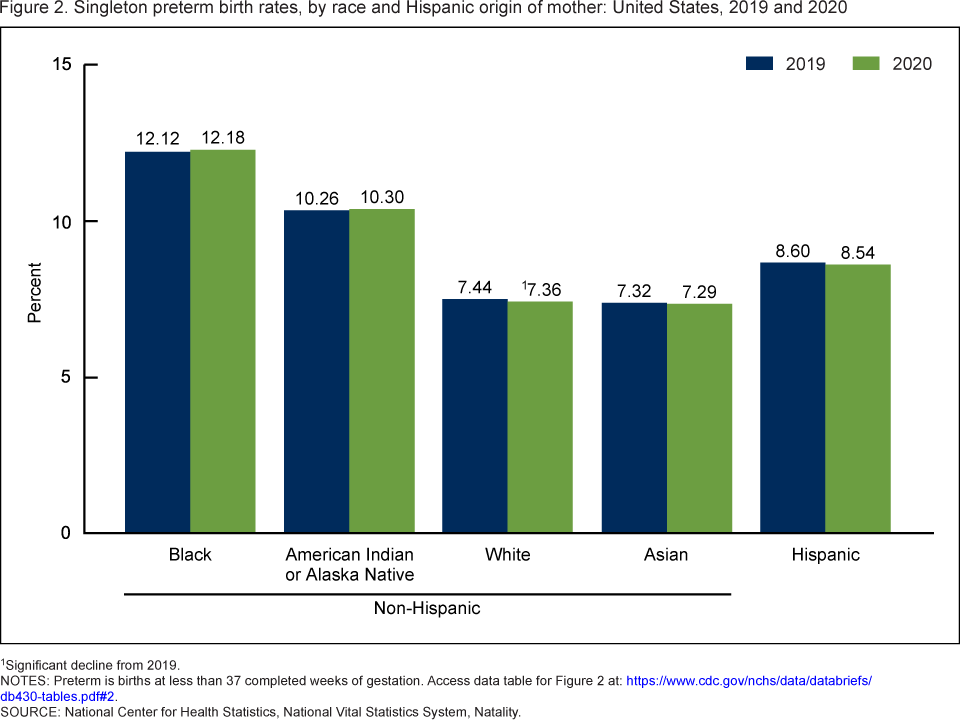 - The singleton preterm birth rate among births to non-Hispanic White mothers declined 1%; changes in rates for non-Hispanic Black, non-Hispanic American Indian Alaska Native, and Hispanic mothers were not significant.