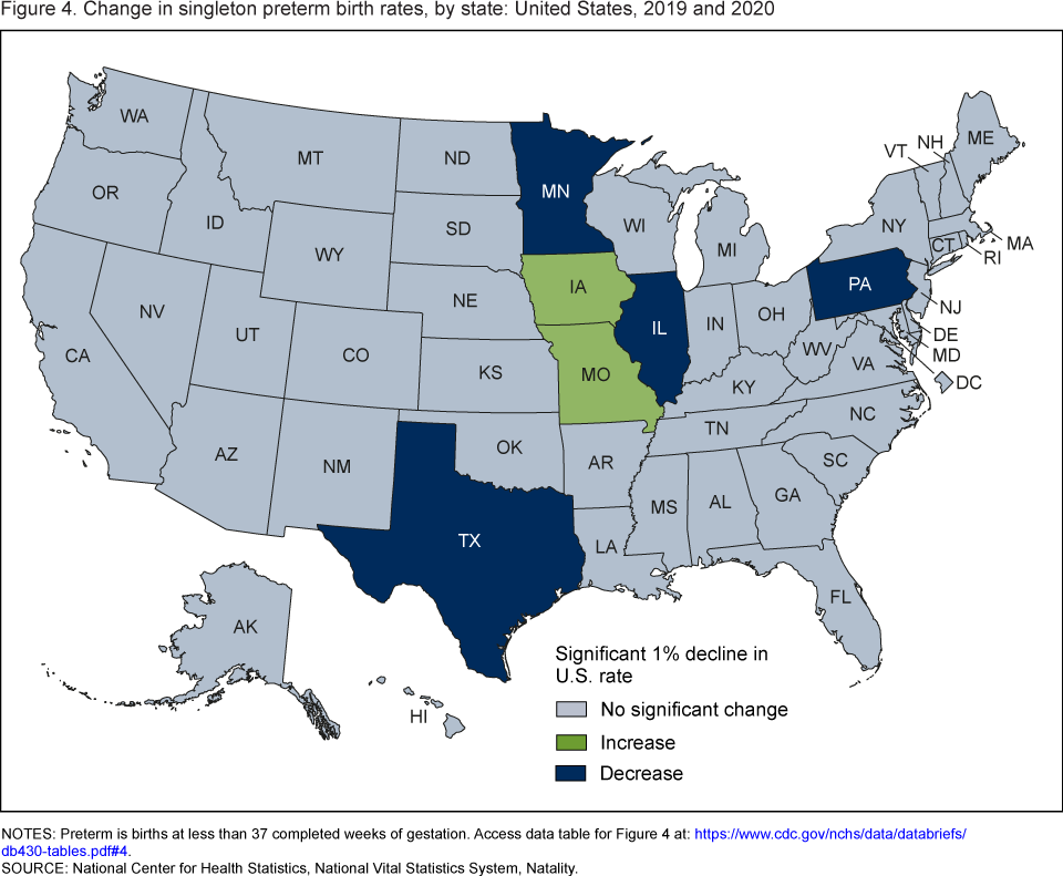 - Preterm birth rates for singletons declined by 1%–5% in four states between 2019 and 2020 (Illinois, Minnesota, Pennsylvania, and Texas) and increased by 4–5% in two states (Iowa and Missouri) (Figure 4).
