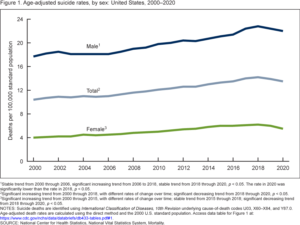 Garnett MF, Curtin SC, Stone DM. Suicide mortality in the United States, 2000–2020. NCHS Data Brief, no 433. Hyattsville, MD: National Center for Health Statistics. 2022. DOI: https://dx.doi.org/10.15620/cdc:114217