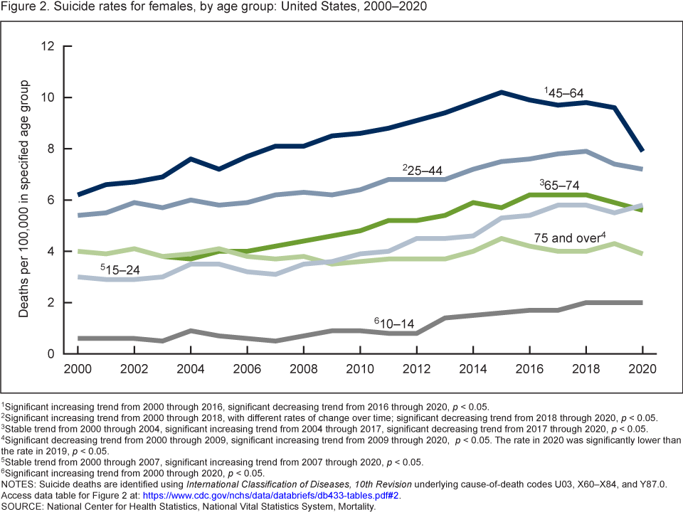 - The suicide rate for females increased from 2000 (4.0) through 2015 (6.0) and was stable from 2015 through 2018 (6.2). The rate then declined to 6.0 in 2019 and 5.5 in 2020.
