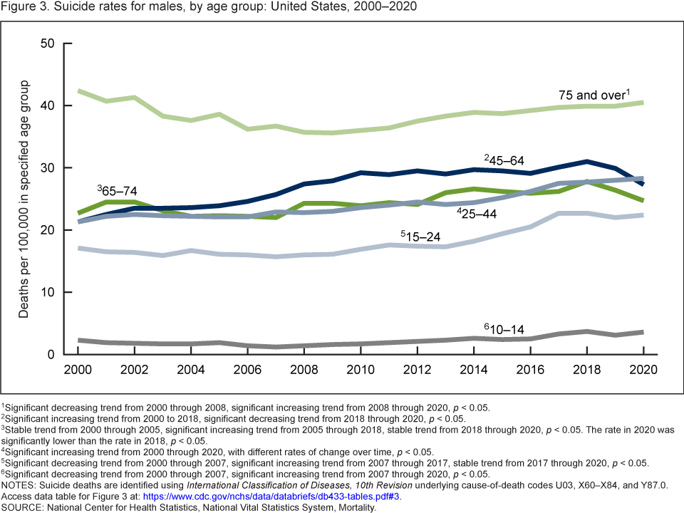 - From 2000 through 2020, male suicide rates were consistently highest in those aged 75 and over. Rates declined from 2000 (42.4) to 2008 (35.7), and then increased to 40.5 in 2020.