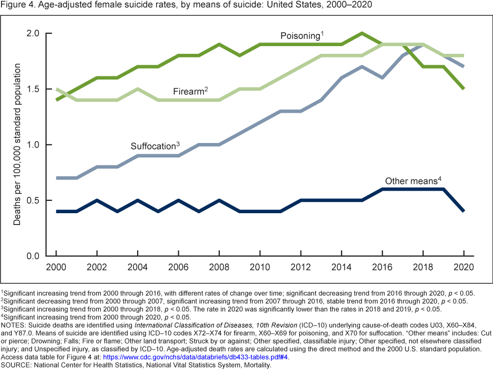 - Among females, the rate for suffocation-related suicide (including hanging, asphyxiation, strangulation, and other means) more than doubled over the period, from 0.7 in 2000 to 1.7 in 2020. However, the rate in 2020 was significantly lower than in 2018 (1.9).