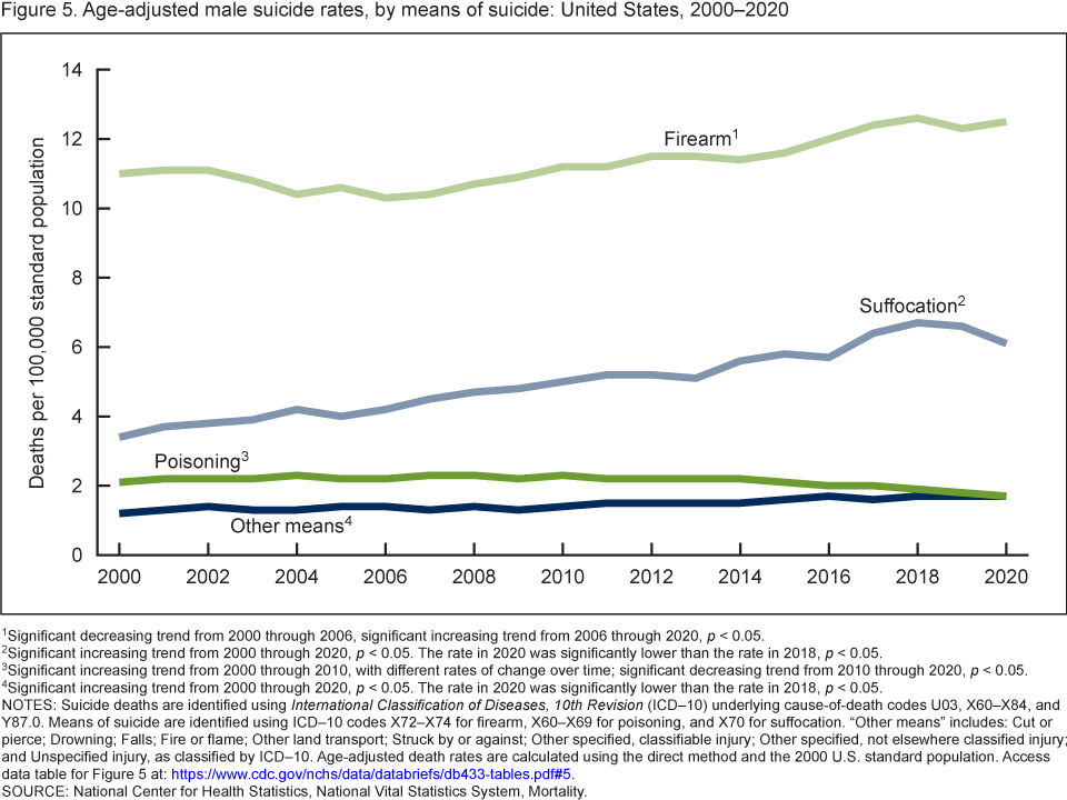 - The difference in rates for firearm-related suicide and suffocation-related suicide narrowed over the period, from more than 3 times higher for firearms in 2000 (11.0 compared with 3.4) to 2 times higher in 2020 (12.5 compared with 6.1).