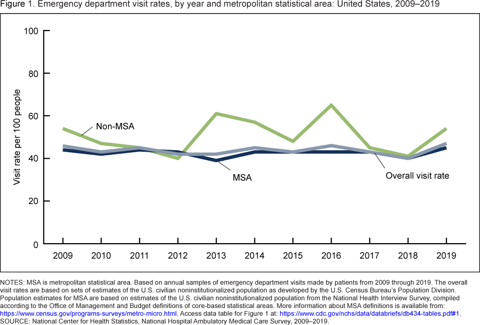 NOTES: MSA is metropolitan statistical area. Based on annual samples of emergency department visits made by patients from 2009 through 2019. The overall visit rates are based on sets of estimates of the U.S. civilian noninstitutionalized population as developed by the U.S. Census Bureau’s Population Division. Population estimates for MSA are based on estimates of the U.S. civilian noninstitutionalized population from the National Health Interview Survey, compiled according to the Office of Management and Budget definitions of core-based statistical areas. More information about MSA definitions is available from: https://www.census.gov/programs-surveys/metro-micro.html. Access data table for Figure 1 .