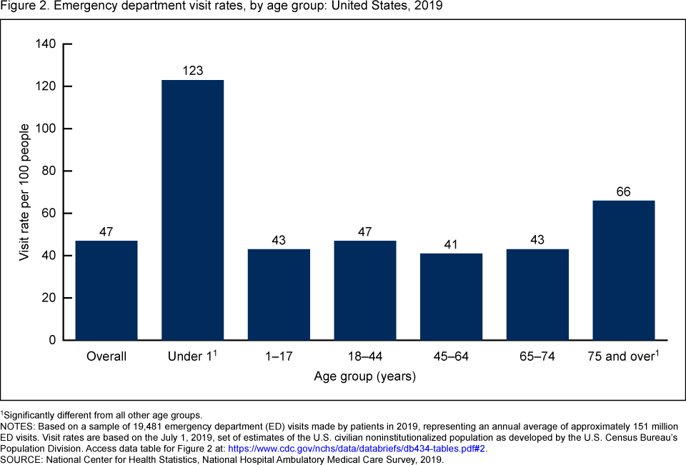 - In 2019, the ED visit rate for infants under age 1 year was 123 visits per 100 infants, which was highest compared with all other age groups (Figure 2).