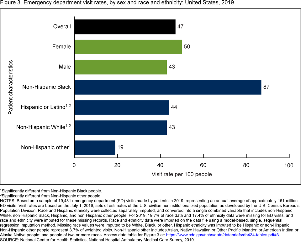 Cairns C, Ashman JJ, Kang K. Emergency department visit rates by selected characteristics: United States, 2019. NCHS Data Brief, no 434. Hyattsville, MD: National Center for Health Statistics. 2022. DOI: https://dx.doi.org/10.15620/cdc:114424.