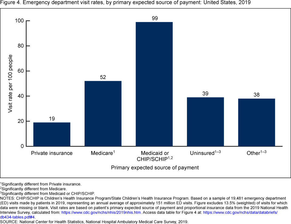 - The ED visit rate was highest for patients with Medicaid or Children’s Health Insurance Program/State Children’s Health Insurance Program (CHIP/SCHIP) (99 visits per 100 people) (Figure 4).