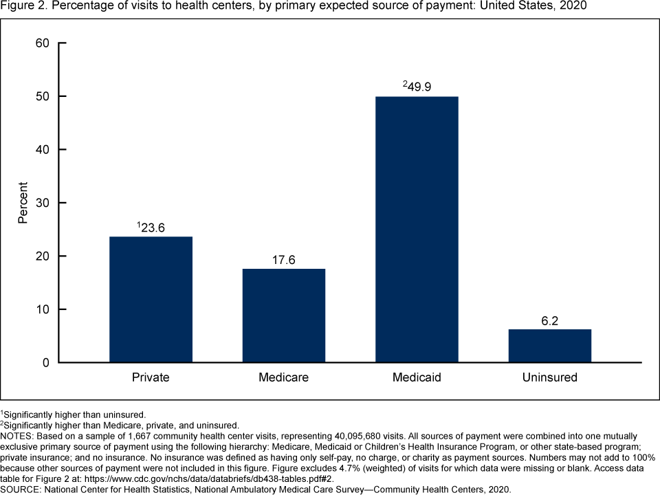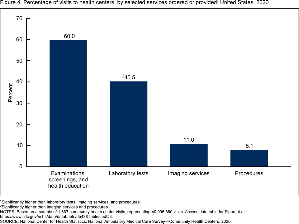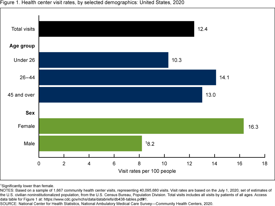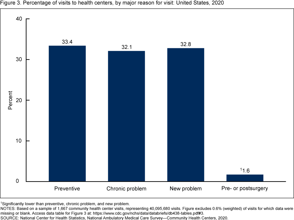 Santo L, Schappert SM, Ashman JJ. Characteristics of visits to health centers: United States, 2020. NCHS Data Brief, no 438. Hyattsville, MD: National Center for Health Statistics. 2022. DOI: https://dx.doi.org/10.15620/cdc:117898.