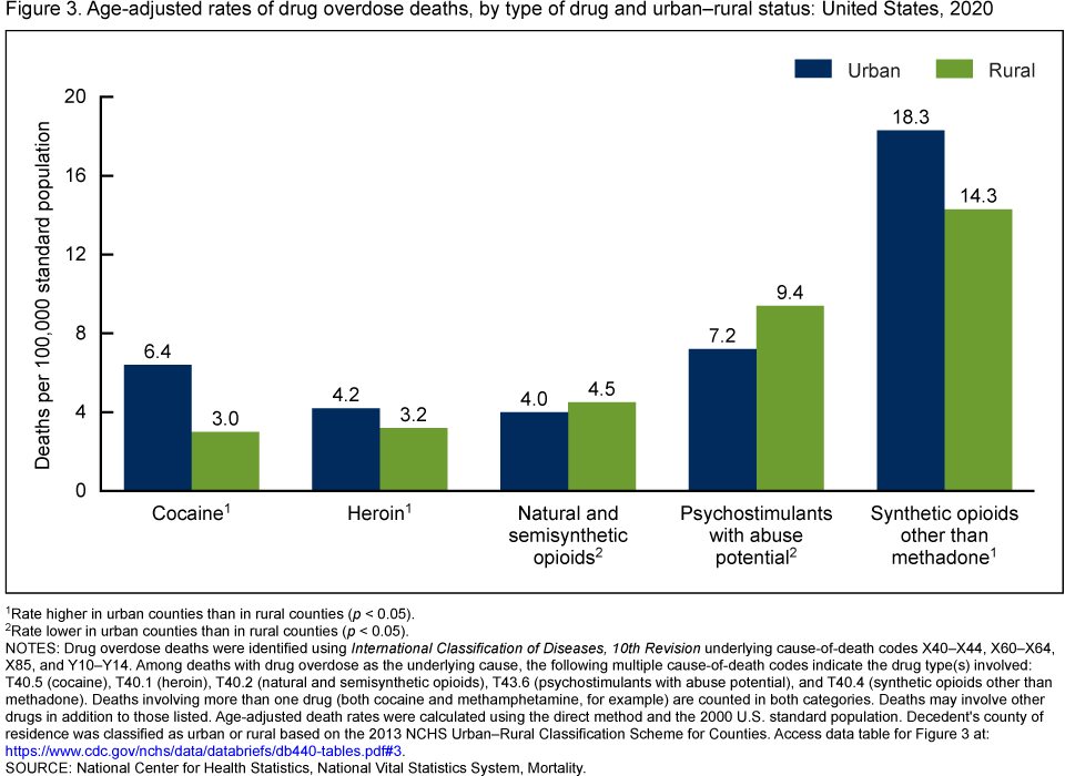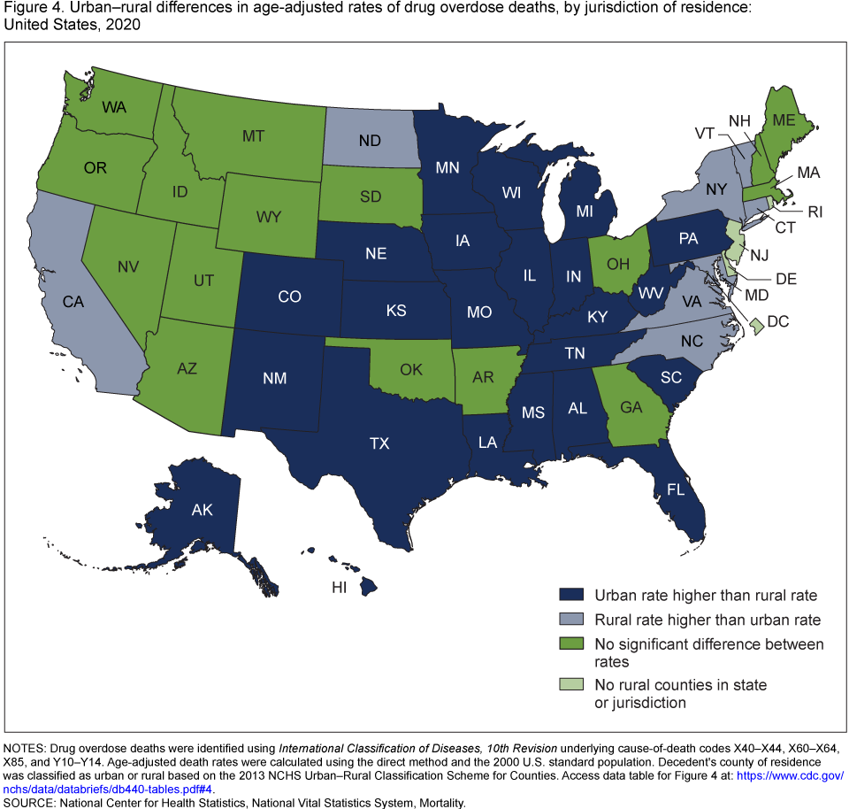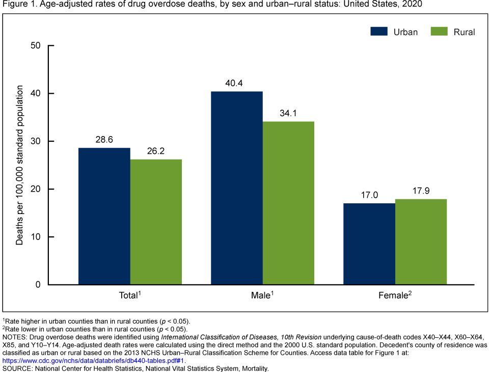 Spencer MR, Garnett MF, Miniño AM. Urban–rural differences in drug overdose death rates, 2020. NCHS Data Brief, no 440. Hyattsville, MD: National Center for Health Statistics. 2022. DOI: https://dx.doi.org/10.15620/cdc:118601.