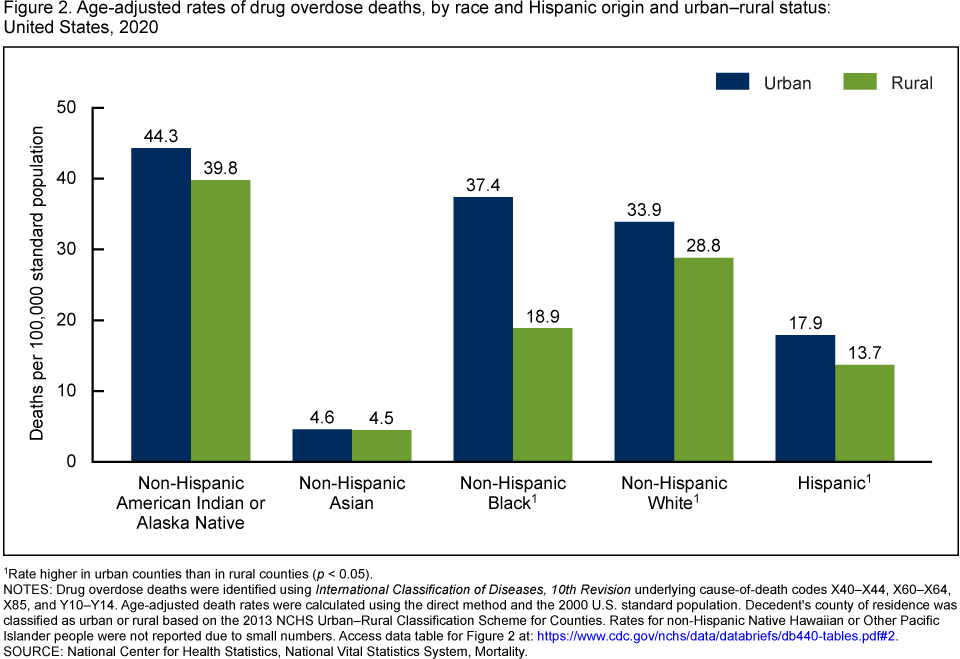 - Non-Hispanic American Indian or Alaska Native (AIAN) people had the highest rates of drug overdose deaths in urban and rural counties, at 44.3 per 100,000 and 39.8, respectively (Figure 2).
