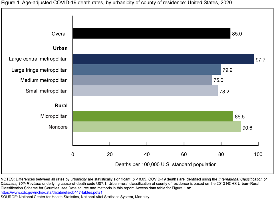 Curtin SC, Heron M. COVID-19 death rates in urban and rural areas: United States, 2020. NCHS Data Brief, no 447. Hyattsville, MD: National Center for Health Statistics. 2022. DOI: https://dx.doi.org/10.15620/cdc:121523.
