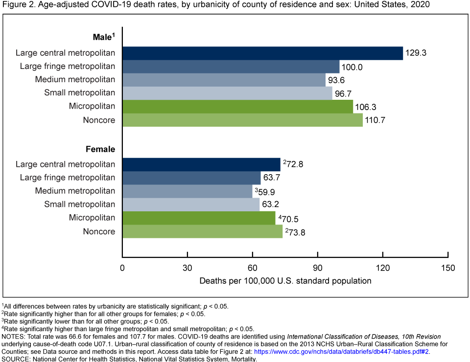 - The age-adjusted COVID-19 death rate in 2020 for males was highest in the most urban areas (large central metropolitan) (129.3), followed by noncore (110.7), micropolitan (106.3), large fringe metropolitan (100.0), and small metropolitan (96.7) areas. The rate was lowest in medium metropolitan areas (93.6) (Figure 2).
