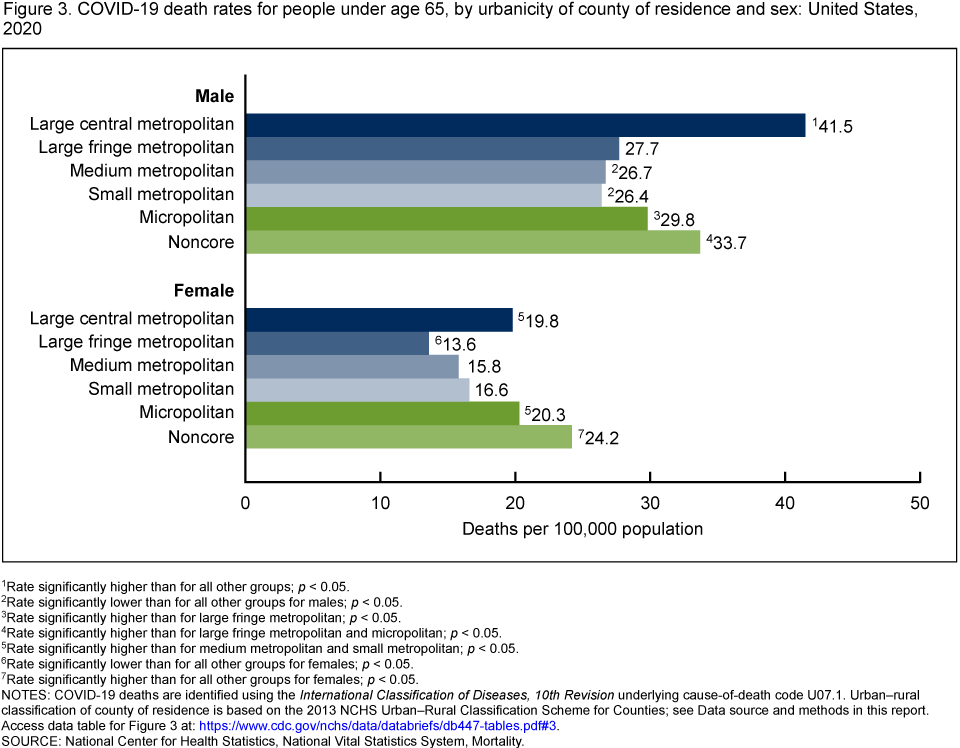 - Among females under age 65, those in the most rural areas (noncore) had the highest COVID-19 death rates in 2020 (24.2), while those in large fringe metropolitan areas had the lowest rate (13.6). The rates in micropolitan (20.3) and large central metropolitan (19.8) areas were higher than in medium (15.8) and small (16.6) metropolitan areas.