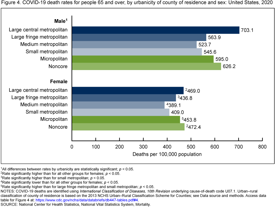 - Females aged 65 and over in the most rural areas (noncore) (472.4) and the most urban areas (large central metropolitan) (469.0) had the two highest COVID-19 death rates in 2020, while those in medium metropolitan areas (389.1) had the lowest.