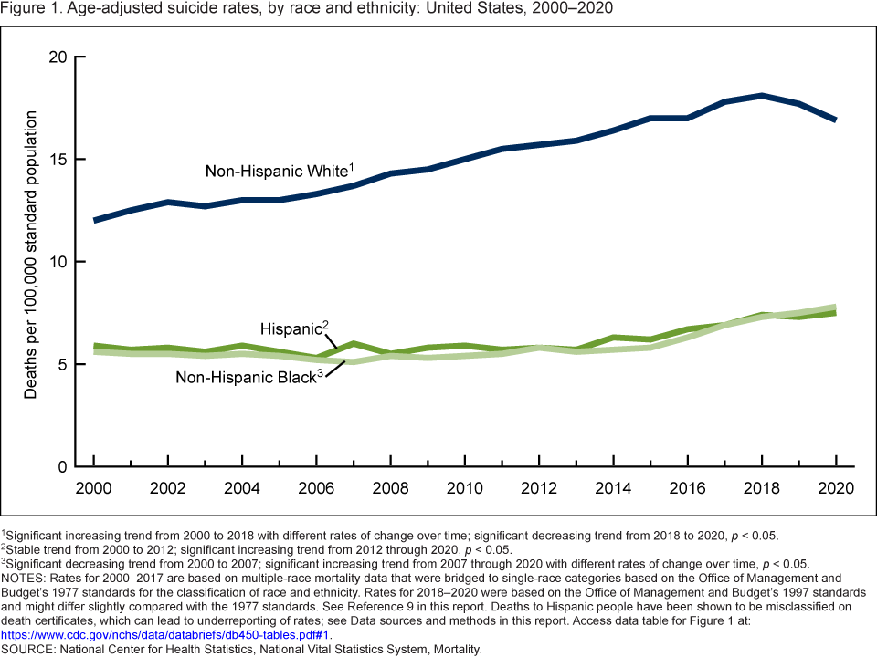 - After increasing between 2000 and 2018, age-adjusted suicide rates for non-Hispanic White people declined from 2018 (18.1 per 100,000 population) to 2020 (16.9), whereas rates increased between 2000 and 2020 for non-Hispanic Black (7.8) and Hispanic (7.5) people.