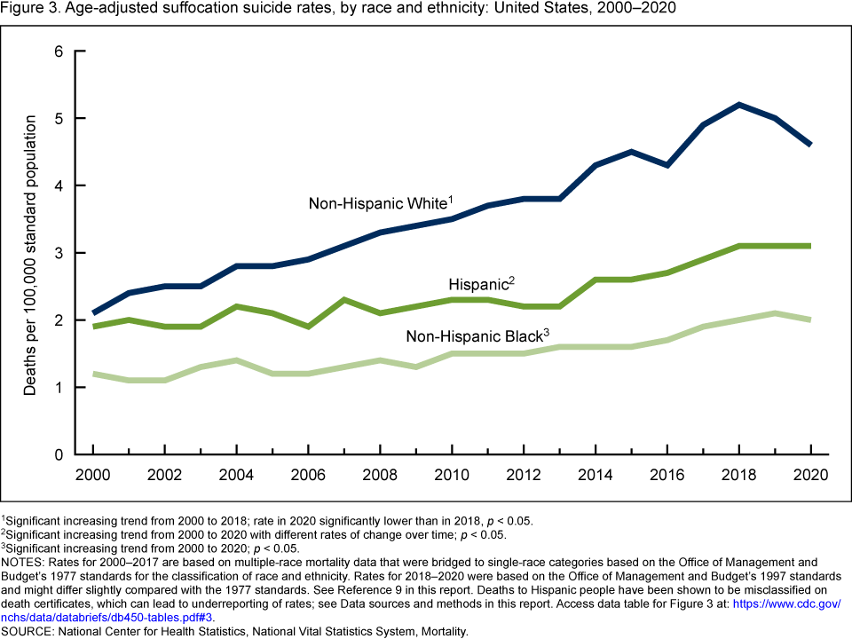 - The age-adjusted suffocation suicide rate (including asphyxiation, strangulation, and other means) for non-Hispanic White people more than doubled from 2000 (2.1 per 100,000) to 2018 (5.2) and then declined 12% through 2020 (4.6) (Figure 3).
