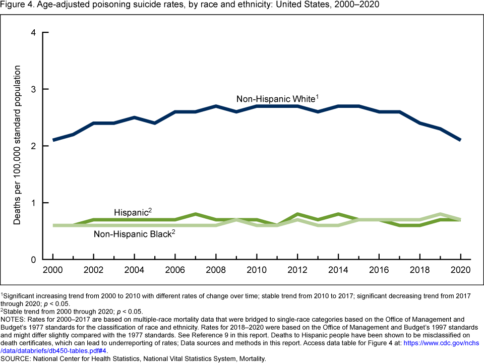 - For non-Hispanic White people, the age-adjusted poisoning suicide rate increased from 2000 (2.1 per 100,000) to 2010 (2.7), was stable from 2010 to 2017 (2.6), and then declined 19% through 2020 (2.1) (Figure 4).