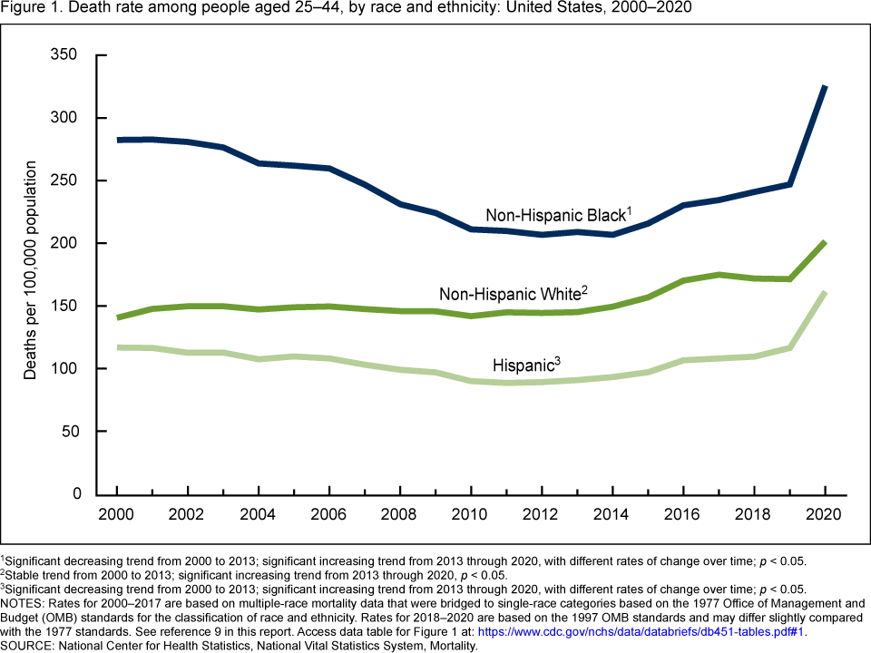 Curtin SC, Xu JQ. Death rates for leading causes of death for people aged 25–44 among the three largest race and ethnicity groups: United States, 2000–2020. NCHS Data Brief, no 451. Hyattsville, MD: National Center for Health Statistics. 2022. DOI: https://dx.doi.org/10.15620/cdc:121796.