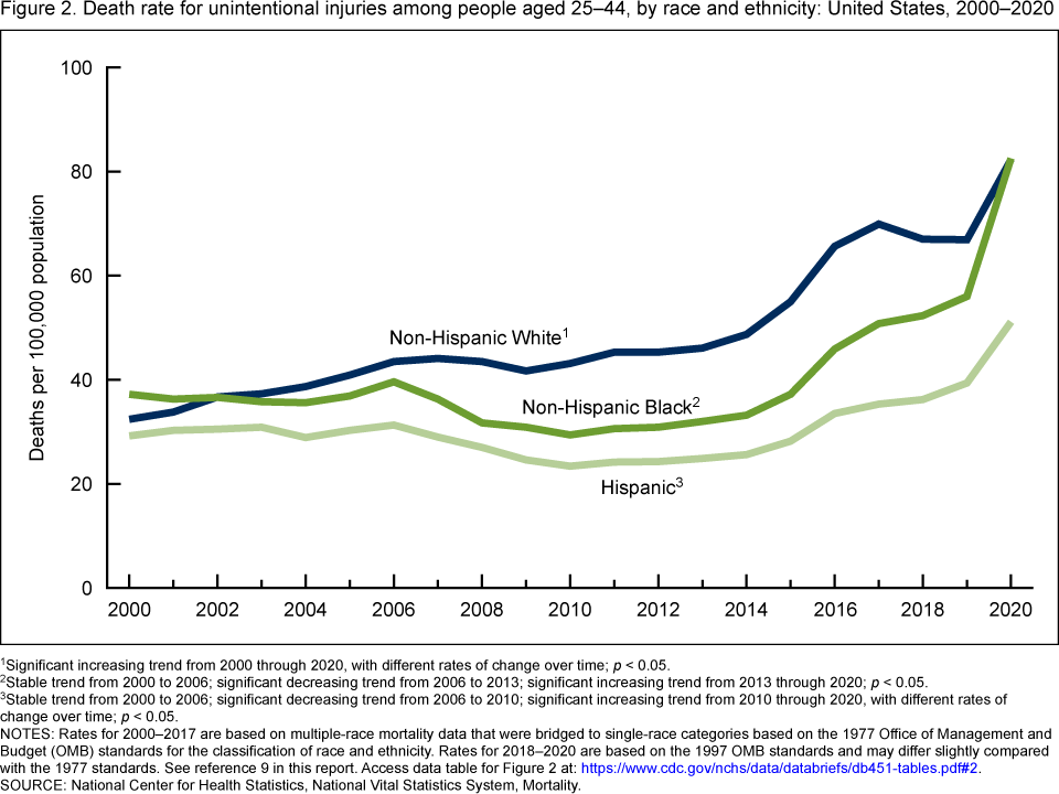 - The death rate for unintentional injuries for non-Hispanic Black people aged 25–44 did not change significantly from 2000 (37.2 per 100,000) to 2006 (39.6), declined 19% through 2013 (32.0), but then increased 75% from 2013 to 2019 (56.0) and 47% from 2019 to 2020 (82.5) (Figure 2).