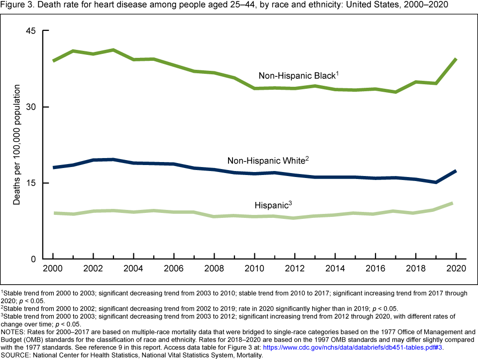 - For non-Hispanic Black people aged 25–44, death rates for heart disease had periods of stability and decline from 2000 to 2017 and then increased 5% through 2019 (34.6), followed by a 14% increase from 2019 through 2020 (39.5) (Figure 3).