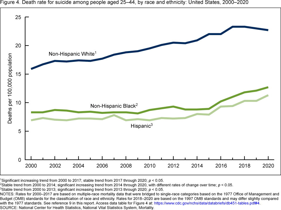 - Suicide rates did not change significantly from 2017 (23.3) to 2020 (22.7) for non-Hispanic White people aged 25–44 but continued to increase through 2020 for non-Hispanic Black (12.7) and Hispanic (11.3) people.