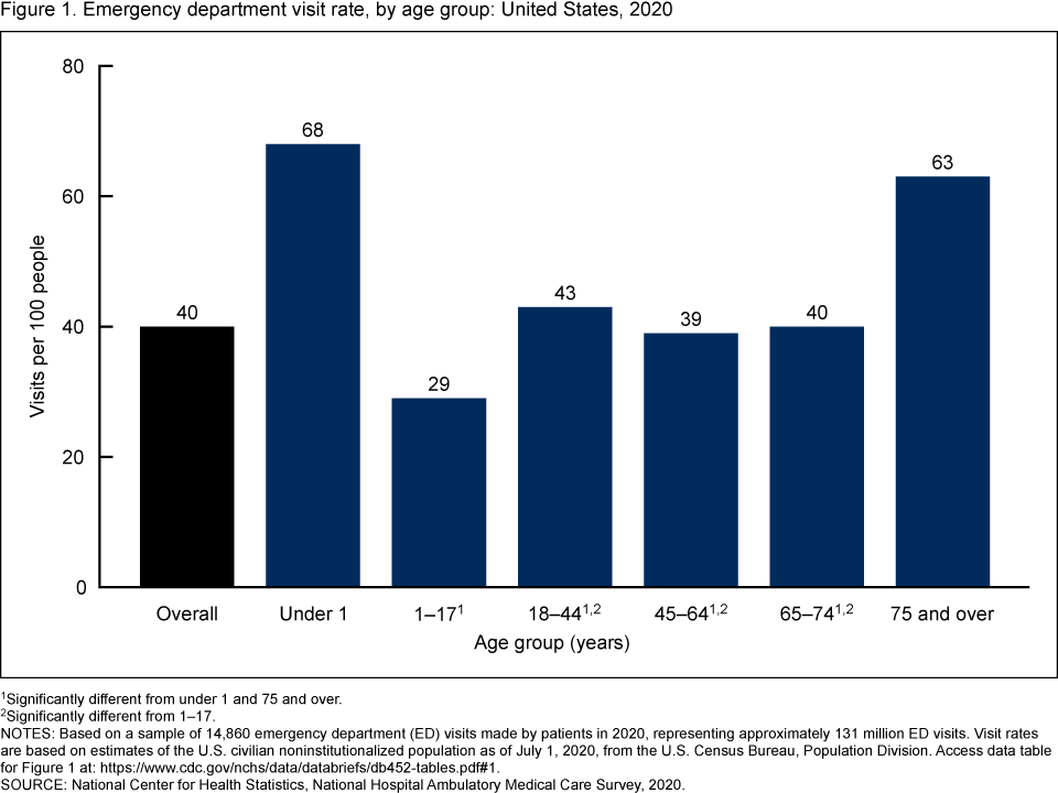 Cairns C, Ashman JJ, King JM. Emergency department visit rates by selected characteristics: United States, 2020. NCHS Data Brief, no 452. Hyattsville, MD: National Center for Health Statistics. 2022. DOI: https://dx.doi.org/10.15620/cdc:121837.