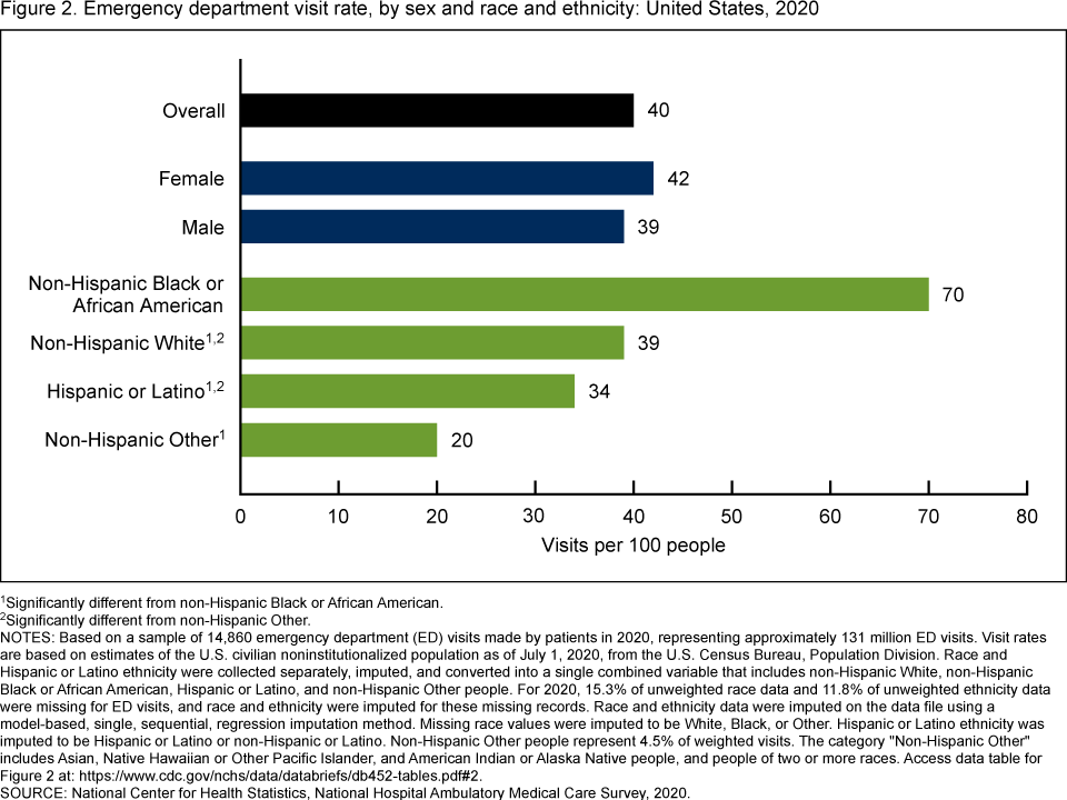- In 2020, the ED visit rate was highest for non-Hispanic Black or African-American people (70 visits) compared with non-Hispanic White (39), Hispanic or Latino (34), and non-Hispanic people of other races (20).