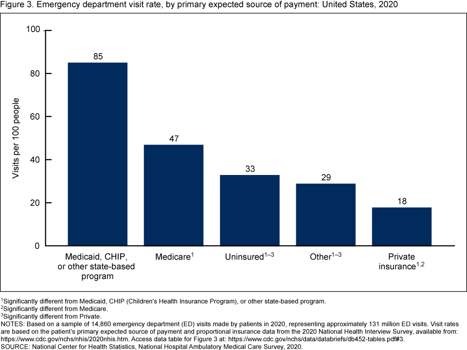 - The ED visit rate was highest for patients with Medicaid, Children’s Health Insurance Program (CHIP), or other state-based programs (85 visits per 100 people) and lowest for patients with private insurance (18) (Figure 3).