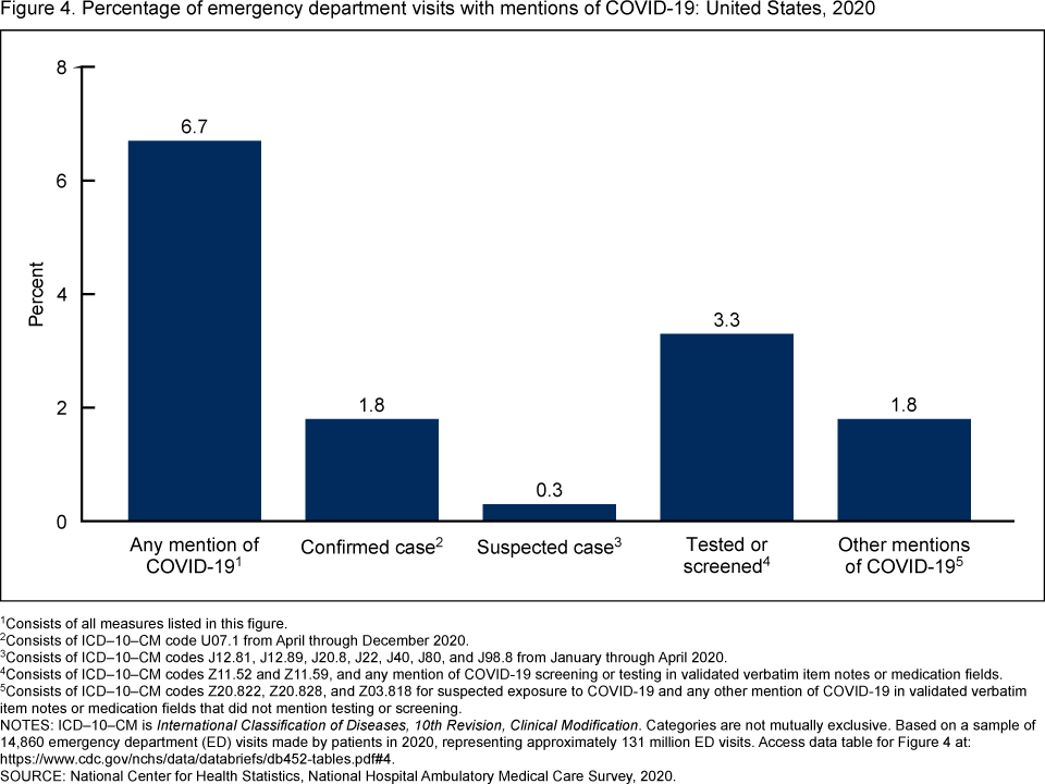 Data in this report show that in 2020, an estimated 6.7% of all ED visits had a mention of COVID-19. During the very early stages of the pandemic, before the International Classification of Diseases, 10th Revision, Clinical Modification (ICD–10–CM) diagnosis code for COVID-19 was created and implemented, approximately 0.3% suspected cases of COVID-19 were identified among ED visits, based on other existing codes. After implementation of the ICD–10–CM code U07.1 starting April 1, 2020, an estimated 1.8% of all ED visits from April through December were identified as a confirmed case of COVID-19. Additionally, 3.3% included a test or screening for COVID-19, and 1.8% were identified as a patient with suspected exposure to COVID-19 or included some other mention of COVID-19, not identified above.