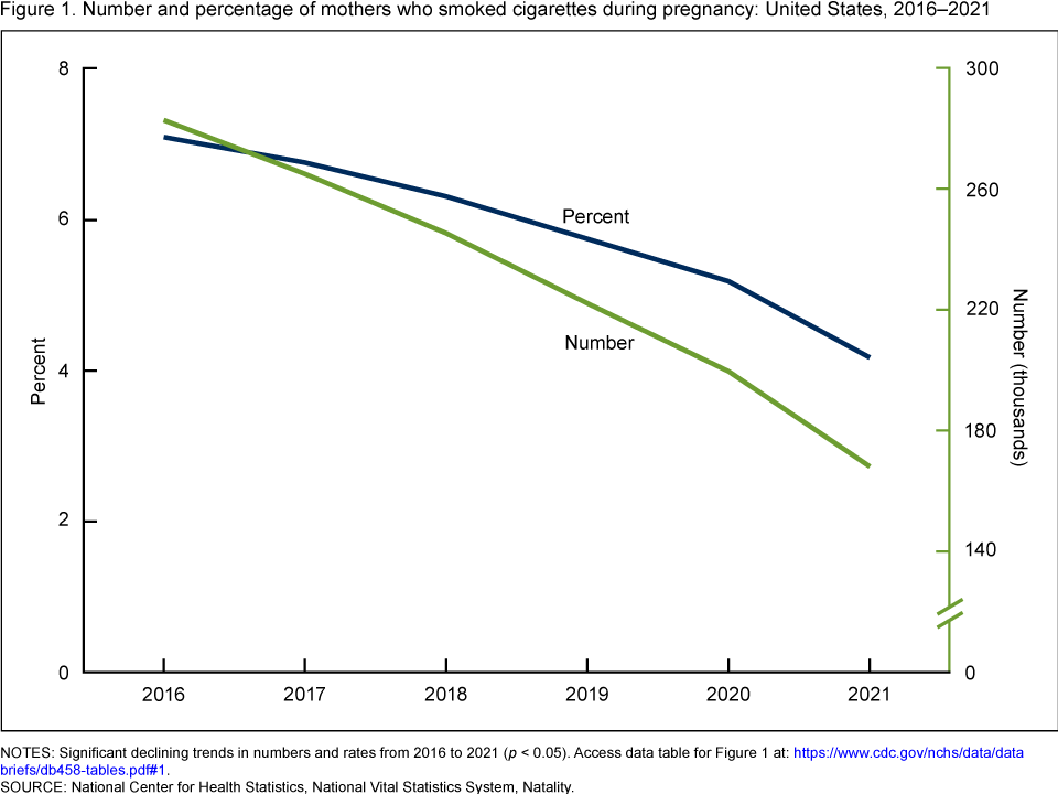 Martin JA, Osterman MJK, Driscoll AK. Declines in cigarette smoking during pregnancy in the United States, 2016–2021. NCHS Data Brief, no 458. Hyattsville, MD: National Center for Health Statistics. 2023. DOI: https://dx.doi.org/10.15620/cdc:123360.