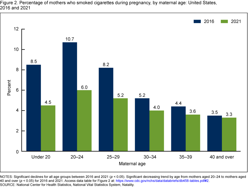 - Cigarette smoking during pregnancy declined for each maternal age group from 2016 to 2021.