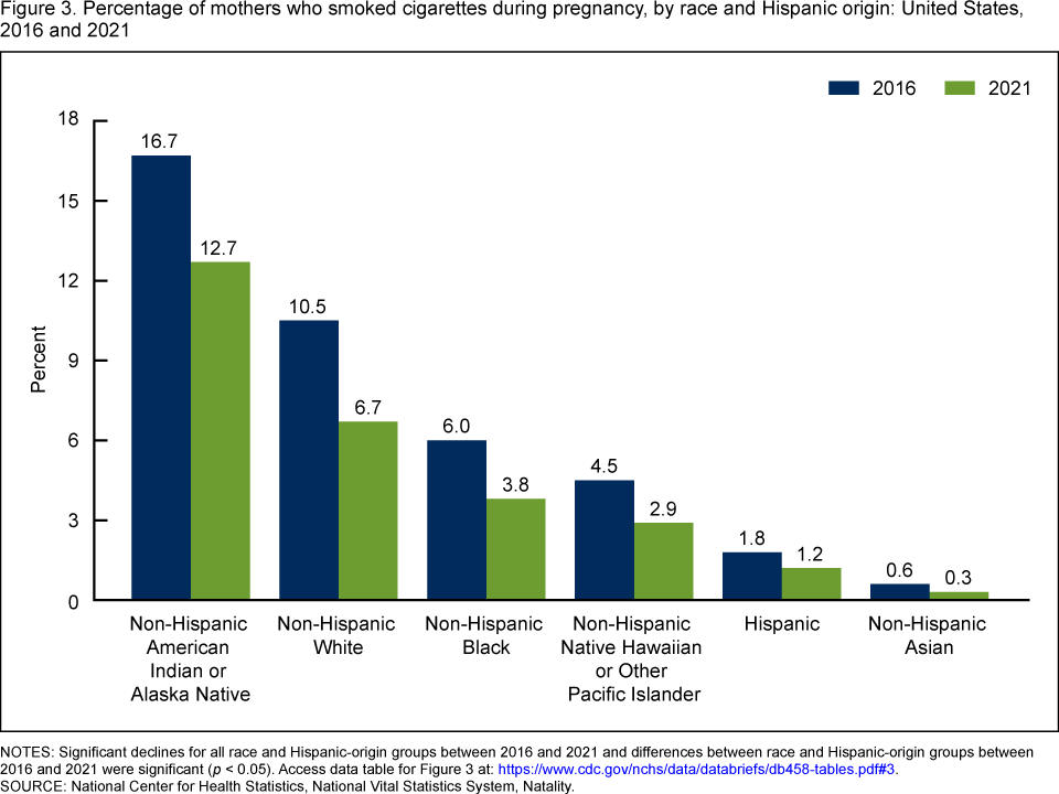- Cigarette smoking during pregnancy declined for each of the race and Hispanic-origin groups from 2016 to 2021.