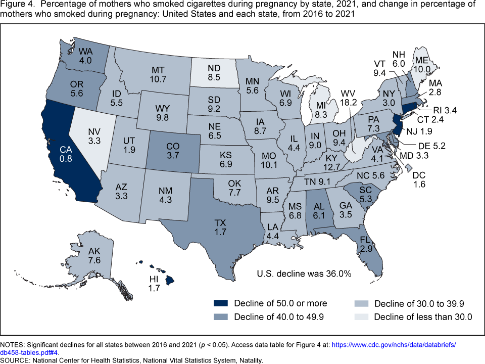 Cigarette smoking during pregnancy declined in all 50 states and the District of Columbia between 2016 to 2021.
