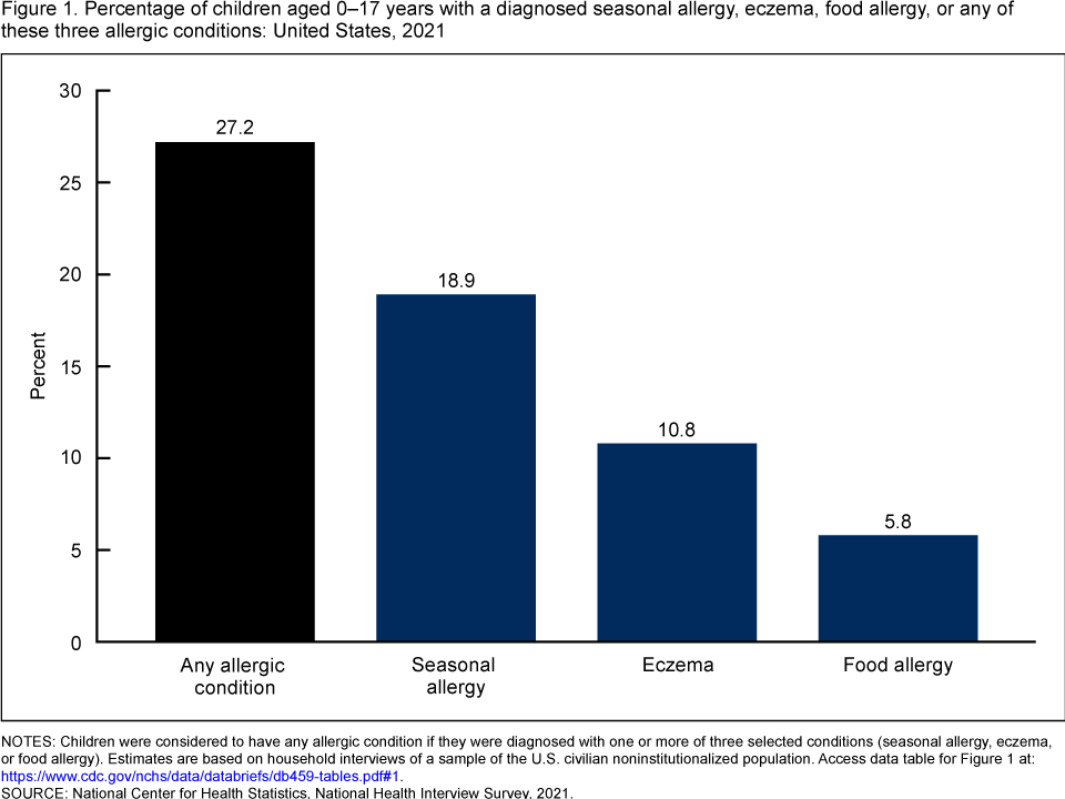 - In 2021, 27.2% of children had one or more selected allergic conditions. About 1 in 5 children had a seasonal allergy (18.9%), 1 in 10 had eczema (10.8%), and 1 in 20 had a food allergy (5.8%) (Figure 1).