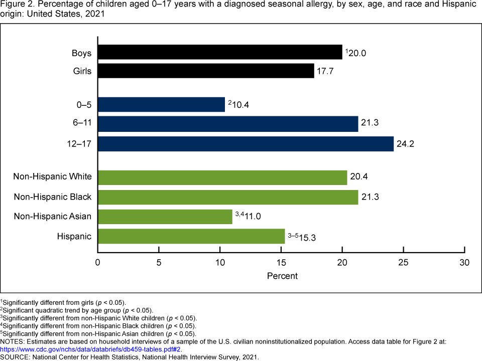- Non-Hispanic Black (21.3%) and non-Hispanic White (20.4%) children were more likely to have a seasonal allergy than Hispanic (15.3%) and non-Hispanic Asian (11.0%) children.