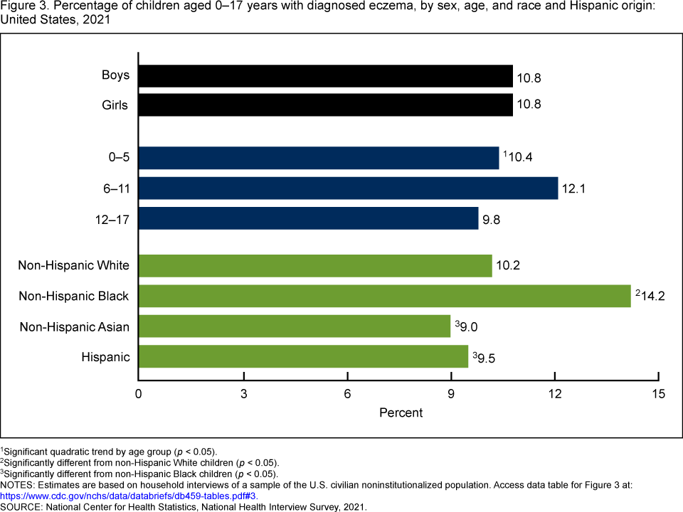 - Non-Hispanic Black children (14.2%) were more likely to have eczema than non-Hispanic White (10.2%), Hispanic (9.5%), and non-Hispanic Asian (9.0%) children.