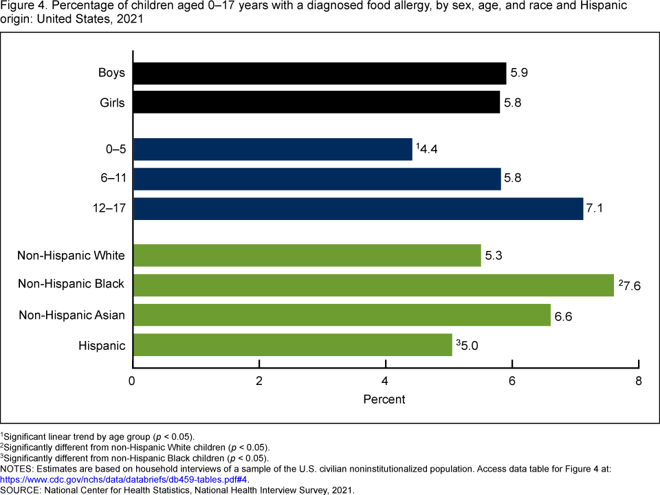 - Non-Hispanic Black children (7.6%) were more likely to have a food allergy compared with non-Hispanic White (5.3%) and Hispanic (5.0%) children.