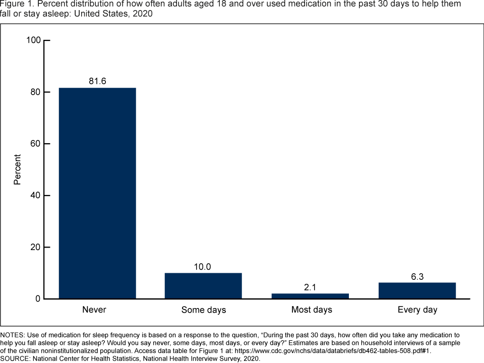 Reuben C, Elgaddal N, Black LI. Sleep medication use in adults aged 18 and over: United States, 2020. NCHS Data Brief, no 462. Hyattsville, MD: National Center for Health Statistics. 2023. DOI: https://dx.doi.org/10.15620/cdc:123013.