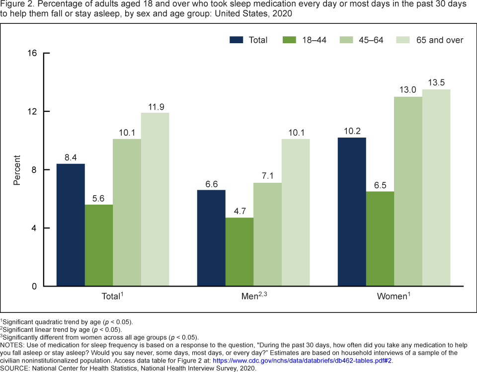 - In 2020, the percentage of adults who took medication for sleep increased with age, from 5.6% of those aged 18–44, to 10.1% of those aged 45–64, and 11.9% of those aged 65 and over (Figure 2).