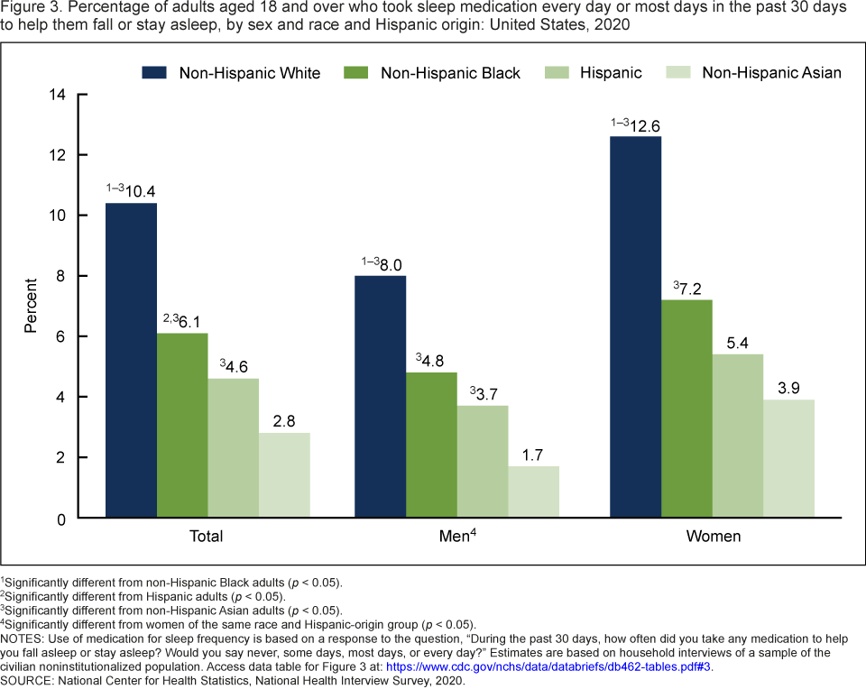- Across all race and Hispanic-origin groups, men were less likely than women to take sleep medication.
