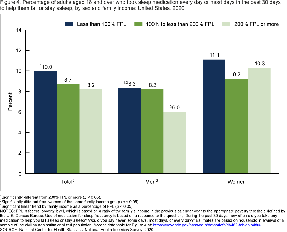 - Among men, those with family income of 200% of FPL or more (6.0%) were less likely to take sleep medication than those with family income less than 100% of FPL (8.3%) and 100% to less than 200% of FPL (8.2%).