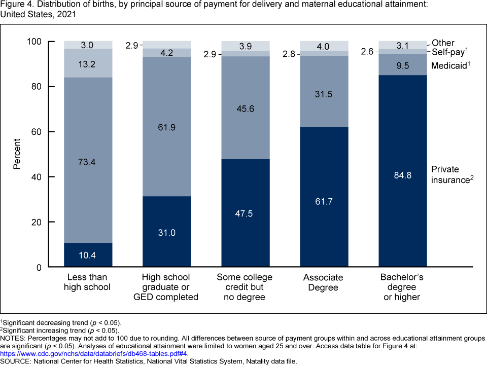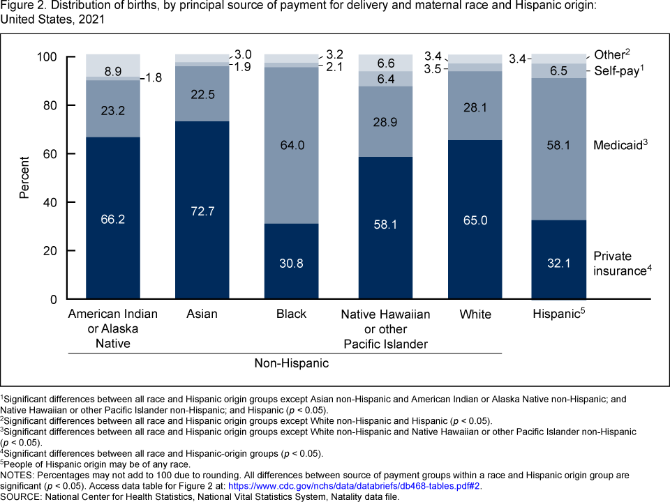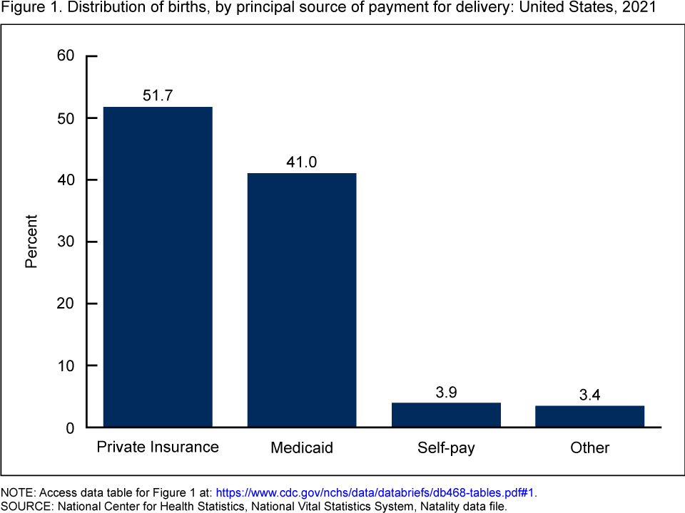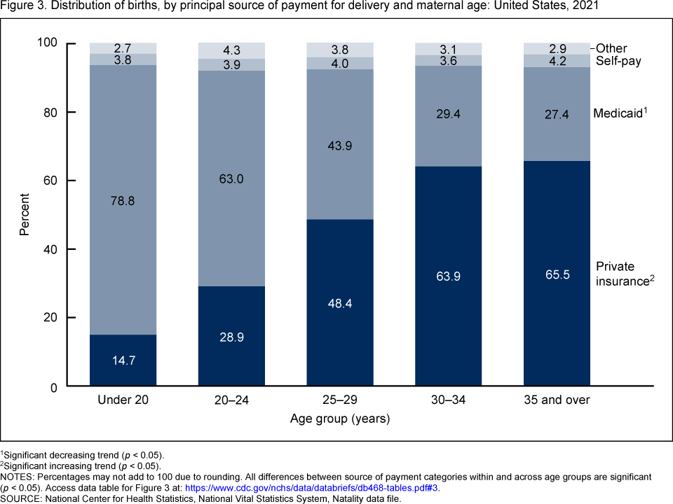 Valenzuela CP, Osterman MJK. Characteristics of mothers by source of payment for the delivery: United States, 2021. NCHS Data Brief, no 468. Hyattsville, MD: National Center for Health Statistics. 2023. DOI: https://dx.doi.org/10.15620/cdc:127266.