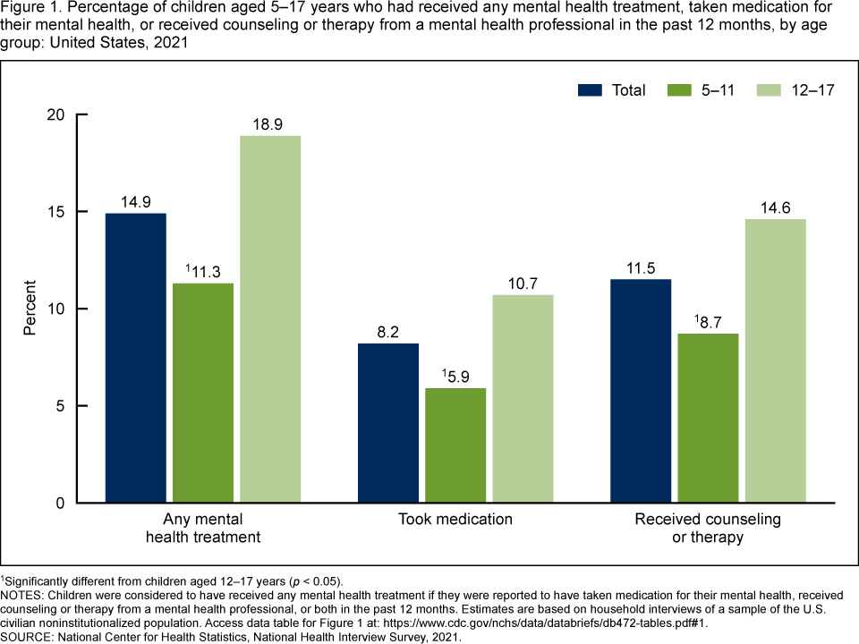 Zablotsky B, Ng AE. Mental health treatment among children aged 5–17 years: United States, 2021. NCHS Data Brief, no 472. Hyattsville, MD: National Center for Health Statistics. 2023. DOI: https://dx.doi.org/10.15620/cdc:128144.