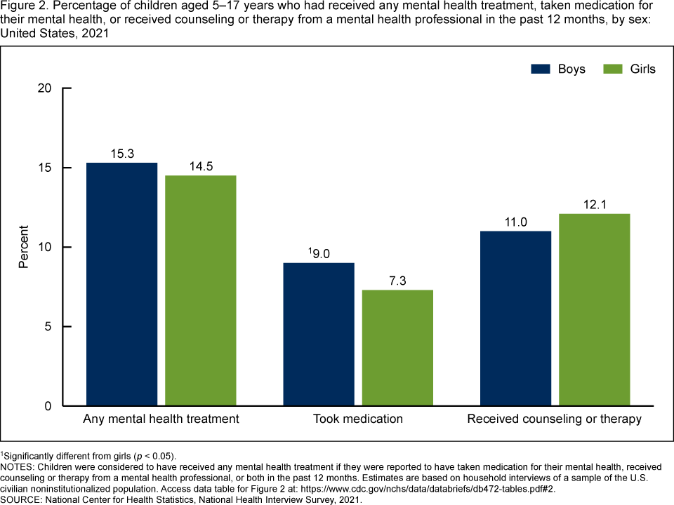 Figure 2. Percentage of children aged 5–17 years who had received any mental health treatment, taken medication for their mental health, or received counseling or therapy from a mental health professional in the past 12 months, by sex: United States, 2021