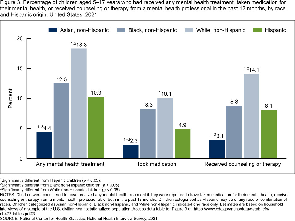 Figure 3. Percentage of children aged 5–17 years who had received any mental health treatment, taken medication for their mental health, or received counseling or therapy from a mental health professional in the past 12 months, by race and Hispanic origin: United States, 2021